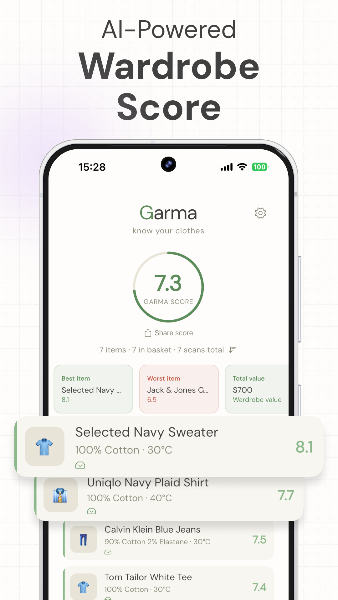 Scan any clothing label with AI. Get sustainability scores, material quality ratings, smart wardrobe management, and color-aware laundry sorting — all from a photo of your care label.