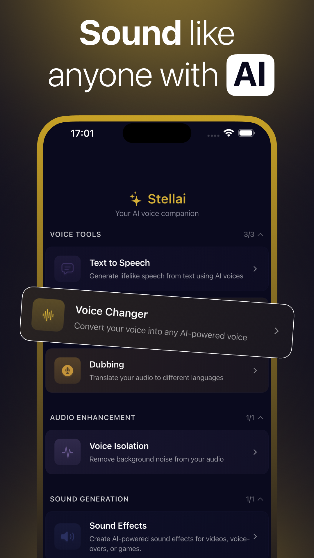 Transform your voice into any of 250+ celebrity and professional voices. Text-to-speech, dubbing in 29 languages, voice isolation, and AI sound effects — all in one app.